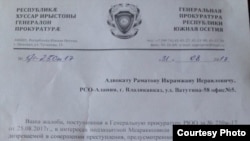25 августа адвокат Тамары обжаловал постановление о возбуждении уголовного дела в Генеральную прокуратуру РЮО. 31 августа на жалобу ответил начальник отдела генпрокуратуры В.Р. Поляков.