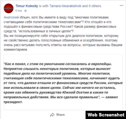 Анатолий Бибилов сегодня впервые ответил зкс-президенту Южной Осетии Эдуарду Кокойты, на прошлой неделе раскритиковавшему югоосетинские власти из-за дела Татунашвили. Он отметил, что неприятно слышать такое от некоторых политиков, которые «считают себя политическими тяжеловесами» и «начинают худеть от того, что отошли от финансовых средств России, которые они использовали в своих целях». Эта реплика вызвала возмущение сторонников бывшего президента в соцсетях. Анатолий Бибилов лично включился в полемику в Facebook.
