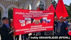 Участники контракции с портретами замученного российскими военными Георгия Анцухелидзе громко призывали полицию к исполнению закона, запрещающего использование в Грузии коммунистической символики.