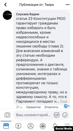 «Статья 23 Конституции РЮО гарантирует гражданам право избирать и быть избранными, кроме недееспособных и находящихся в местах лишения свободы (глава 2). Для внесения изменений в эту статью необходим референдум. А предположения о диктанте, сочинении, знания о таблице умножения, интегралах и дифференциалах противоречат не только Конституции, международному праву, но и здравому смыслу. А то, что в парламент попадают неграмотные депутаты, так мы же сами их выбираем!»