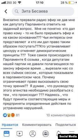 «Очередным вопросом, который мне задали был вопрос: признаем ли мы итоги голосования? Я ответила, что нет, и стала объяснять почему, указав на то, что нами были поданы жалобы в ЦИК и прокуратуру. Внезапно прервали радиоэфир, не дав мне, как депутату парламента, ответить на заданный вопрос. Мне непонятно, кто дал право кому бы то ни было прерывать эфир и на каком основании??? Чьи интересы они представляют и кто им дал право таким образом поступать??? Кто устанавливает цензуру и отменяет демократические принципы???»