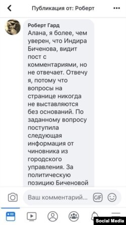 «...По заданному вопросу поступила следующая информация от чиновника из городского управления. За политическую позицию Биченовой городские власти по указке хотели выселить из домовладения семью ее брата, который, насколько я знаю, является сотрудником МИД РФ, по нашедшим внезапно нарушениям в оформлении документов на право собственности. Перед поставленным Индирой выбором она выбрала молчание в соцсетях. Друзья по ФБ сообщили, что сама выехала из города. Информация получена и перепроверена».