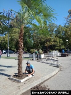 «Мы отобрали восемь пальм, завезли их вчера и выдернули все эти пни. Конечно, работать здесь сложно, очень стесненные городские условия и приствольные лунки сильно заужены. Чтобы не повредить плитку, мы провели такую работу – удалили пни, выкопали в Ботсаду саженцы, привезли и вчера посадили. Сделали обрезку, и, конечно, сразу другая картина».