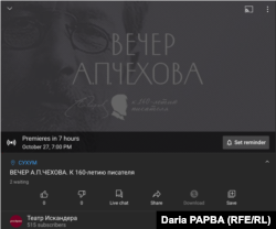 Государственный русский театр драмы имени Фазиля Искандера выпустил специальный онлайн-проект «Вечер Чехова» к 160-летию со дня рождения классика русской литературы. Изначально планировавшаяся в Арт-Фойе, из-за введенных в связи с распространением коронавируса ограничений, премьера состоялась сегодня на YouTube-канале Русдрама.