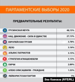 - По предварительным данным ЦИК Грузии, правящая партия «Грузинская мечта» получает на парламентских выборах 48,15% голосов по пропорциональной системе, а оппозиционный блок «ЕНД – Сила в единстве» - 27,13%. Всего в парламент десятого созыва проходят семь партий и два блока.
