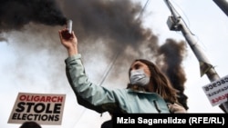 Организаторы протестной акции пустили дымовые шашки черного цвета, подразумевая, что власть «Грузинской мечты» и ЦИК так же очернили итоги выборов