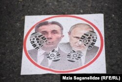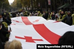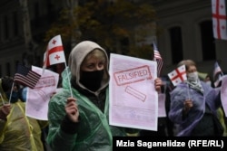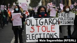 Участники акции организовали живую цепь на проспекте Руставели. Они держали флаги Грузии и США и плакаты: «выборы сфальсифицированы», «олигарх украл выборы».