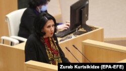 «Мы устали ходить по одному кругу! Пытаться управлять политическими процессами с улицы, провоцируя дестабилизацию, вместо диалога! Тридцать лет несколько поколений простояли на улице! Все, в том числе и я, митинговали на ступенях парламента. Сегодня стране нужно другое! Мы устали от постоянной борьбы двух политических полюсов, которая продолжается по сей день. Мы устали от бесконечной ругани, оскорблений, пренебрежения грузинскими и кавказскими традициями! Ненависть делает страну раздробленной, уязвимой и ослабленной, в то время, когда ей больше всего необходимо мобилизовать национальную энергию для решения проблем. 30 лет – это возраст зрелости и для человека, и для государства. Пора разорвать порочный круг!», – заявила президент Зурабишвили, обращаясь к на треть пустому залу парламента.