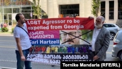 Группа ультраправых активистов сегодня провела две акции. Одну у здания посольства США, вторую – у офиса представительства Евросоюза в Грузии. Они обратились к послам Келли Дегнан и Карлу Харцелю, призвали их покинуть страну. Обращение зачитал ультраправый активист Гурам Палавандишвили.