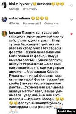 Kuvaeg: Над мальчиками наши осетины смеялись, что, мол, сбежали. А теперь насытитесь кровью! Вот вам и плохие новости за плохими новостями… Джабеличу и Бибилову хочу сказать несколько слов: отправьте на Украину своих сыновей… а наших бедных детей оставьте в покое… У меня сердце болит за Казиева Руслана, и пусть он сейчас для них стал героем, и Коби (Пухаев) отдает честь на том свете… Пока бедные люди не поедут на Украину и не погибнут там, мы их не ценим… Осетия пропадает, хватит проливать кровь!