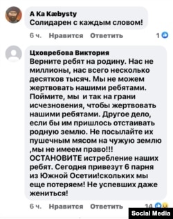 Цховребова Виктория: Верните ребят на родину. Нас не миллионы, нас всего несколько десятков тысяч. Мы не можем жертвовать нашими ребятами. Поймите, мы и так на грани исчезновения, чтобы жертвовать нашими ребятами. Другое дело, если бы им пришлось отстаивать родную землю. Не посылайте их пушечным мясом на чужую землю, мы не имеем право!!! ОСТАНОВИТЕ истребление наших ребят. Сегодня привезут шестого парня из Южной Осетии! Скольких мы еще потеряем! Не успевших даже жениться!