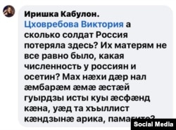Иришка Кабулон: Цховребова Виктория, а сколько солдат Россия потеряла здесь? Их матерям не все равно было, какая численность у россиян и осетин? Мах нӕхи дӕр нал ӕмбарӕм ӕмӕ ӕстӕй гуырдзы исты куы ӕсфӕнд кӕна, уӕд та хъыллист кӕндзынӕ арика, памагите? (Мы уже сами себя не понимаем, а потом, когда Грузия опять что-нибудь начнет, то будем опять кричать «помогите!»)