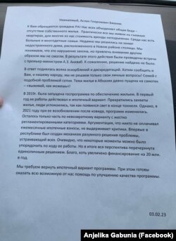 3 февраля трое представителей инициативной группы по вопросу предоставления жилья остронуждающимся пришли на прием к президенту Абхазии Аслану Бжания с письмом, под которым стояли подписи 800 человек. О том, как прошла эта встреча, рассказала ее участница Анжелика Габуния: