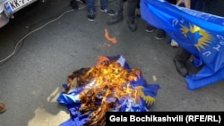Митинг консервативного движения «Альт-инфо» прошел у офиса правящей партии в Тбилиси, на котором участники митинга сожгли флаг «Грузинской мечты».