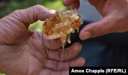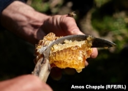 Тамаз Путкарадзе делится кусочком сот из своего урожая на скалах. Мед прозрачный, слегка фруктовый, его приятно есть, запивая горстью холодной воды из горного ручья.
