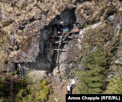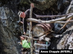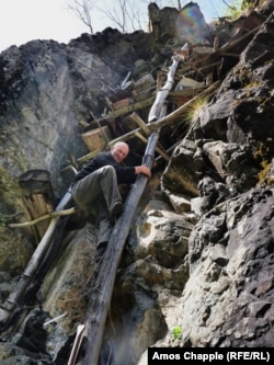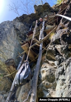 Тамаз Путкарадзе собирает урожай на шатком каркасе из дерева и проволоки, который он встроил около 20 лет назад в расщелину скалы.