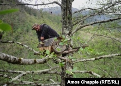 Рамаз Думбадзе проверяет улей на высоте около 16 метров. Он держит 26 ульев джара в лесу вокруг своего дома. Проворный 44-летний мужчина говорит: «Я думаю, что есть что-то особенное в улье, висящем на дереве. Это как отдельное царство, где правят только пчелы».