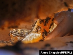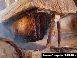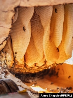 Внутри одного из 20 ульев, принадлежащих мужчине, соты свисают с вершины полого бревна. Он говорит, что всю свою жизнь работал с пчелами в основном для того, чтобы «сохранить традицию», но благодаря растущему рынку уникального меда планирует добавить еще 10 ульев в своё лесное «портфолио».
