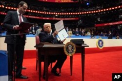 Свои первые указы Трамп подписал на стадионе Capital One Arena, где собрались тысячи его сторонников, чтобы отпраздновать инаугурационный парад.