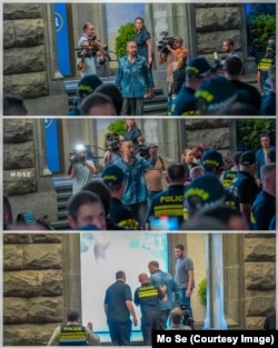 Во время акции произошел еще один инцидент. На кадрах, опубликованных изданием «Публика», видно, что спор между активистами и сторонниками власти перерос в физическое противостояние: один молодой мужчина плюнул в активистку, другой ударил журналиста, фиксировавшего события. Позже еще один сторонник партии власти, легитимность которой не признает оппозиция, пятый президент и значительная часть грузинского общества, плюнул в сотрудника СМИ.